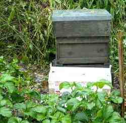 We have sited the hive in a warmer spot in the garden beside a large raised strawberry bed.
